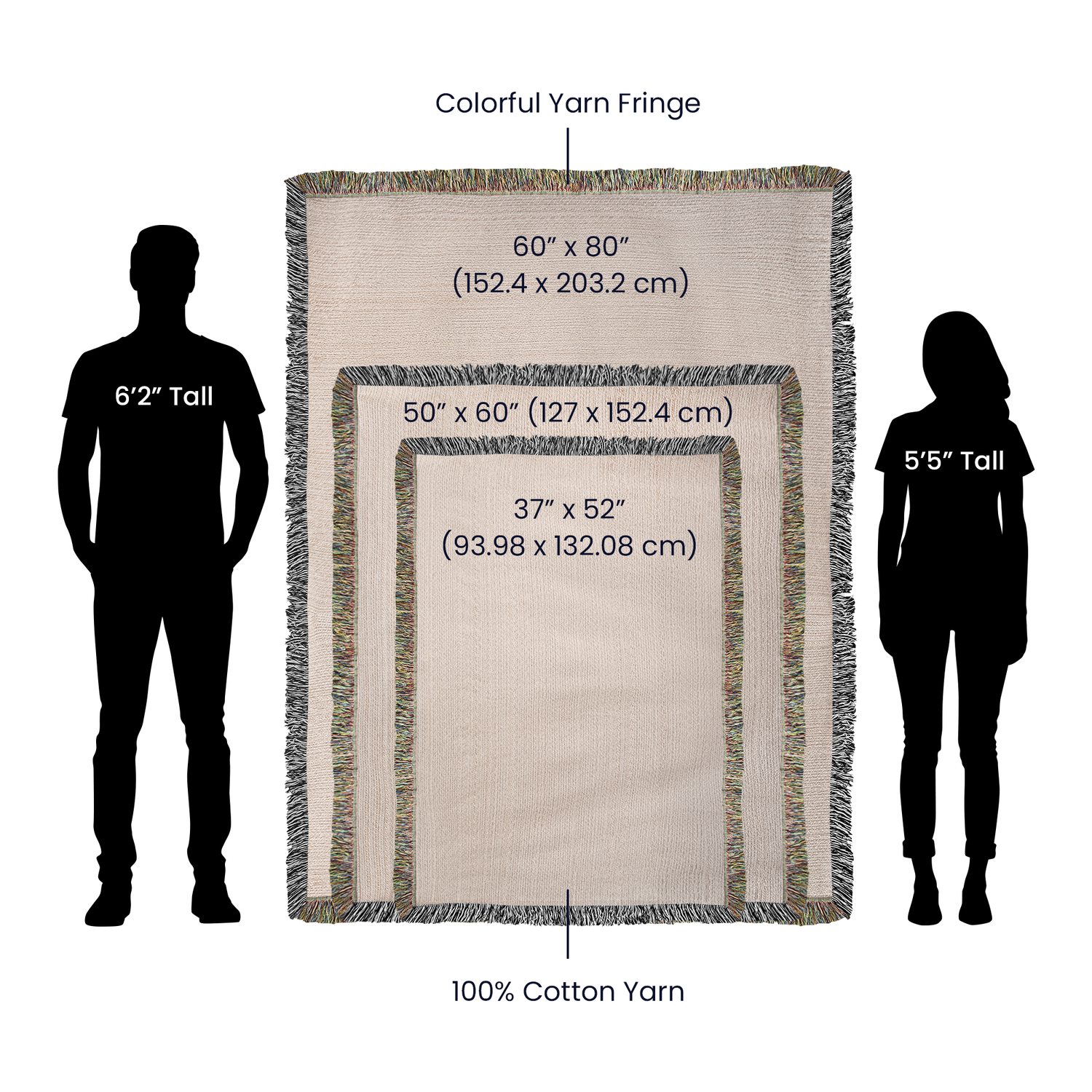 See all three blanket sizes stacked together for easy comparison. Silhouettes of an average-height man and woman on each side show how every size—from small throw to oversized—relates to real-life height, so you can pick the fit that’s just right.