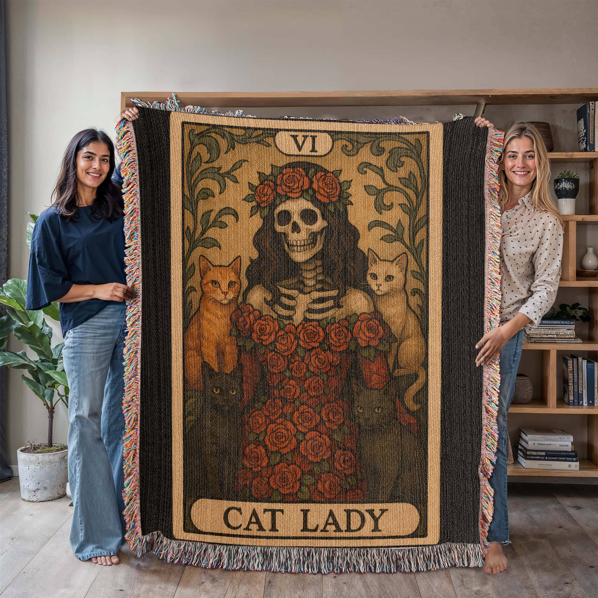 100% Cotton Woven Blanket – Gothic Skeleton Cat Lady Wearing Red Roses Gown with Four Cats, Cat Lady Card Style