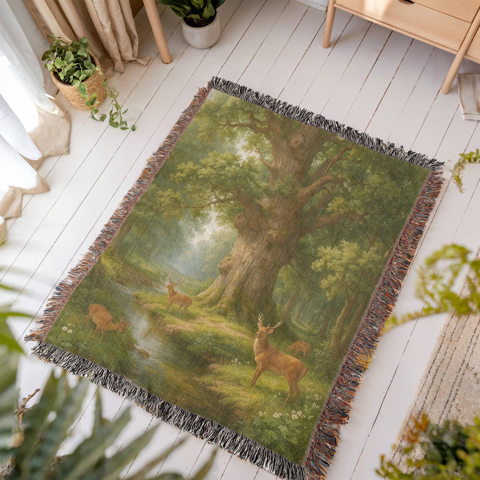 Premium Woven Cotton Throw – Deer Gathering at Stream under Towering Tree