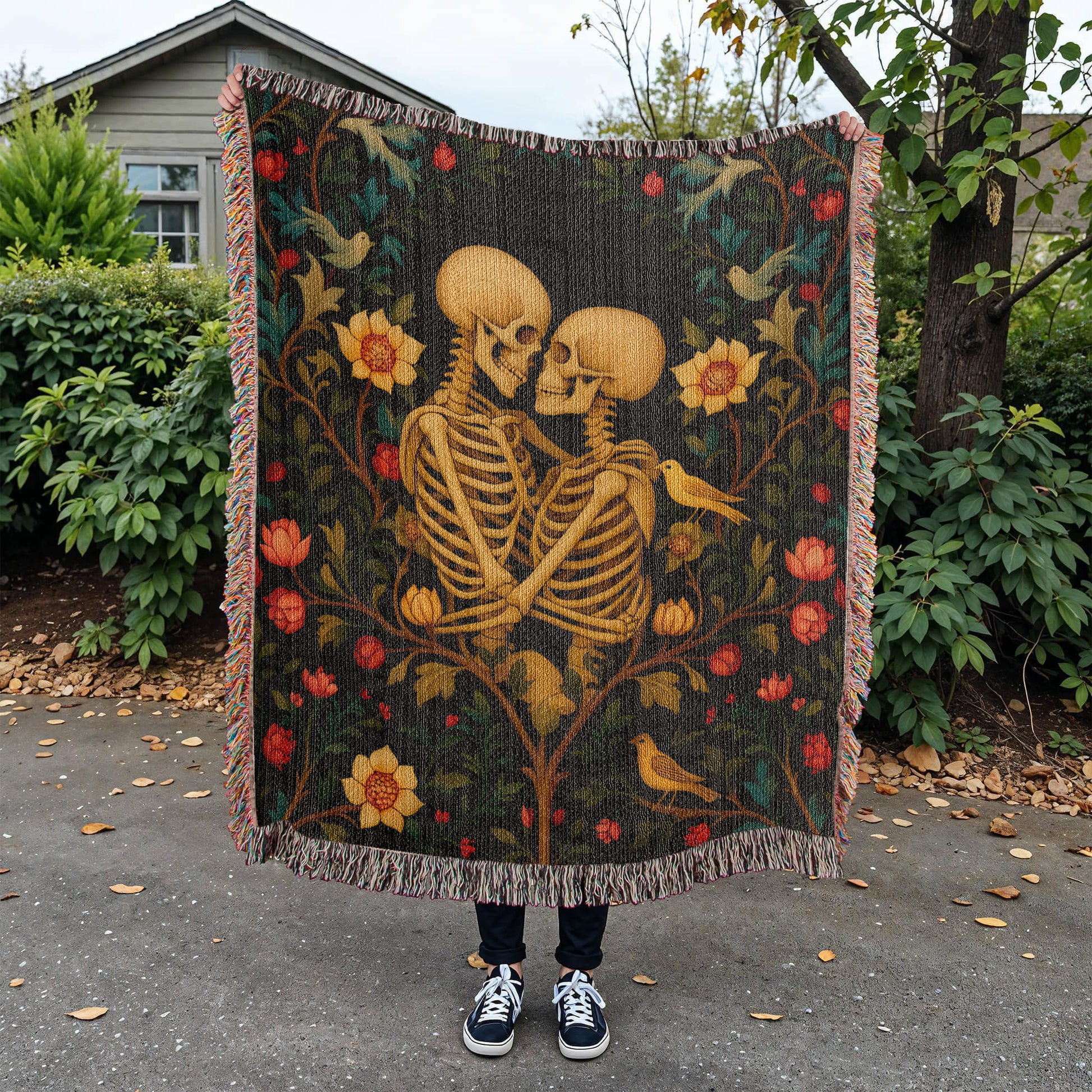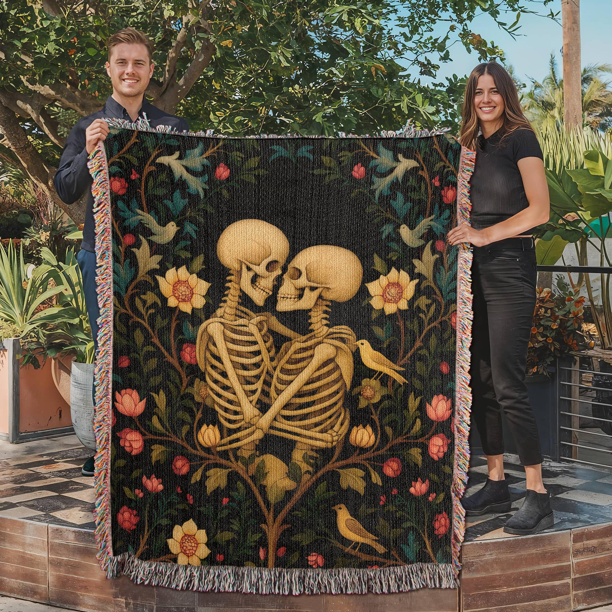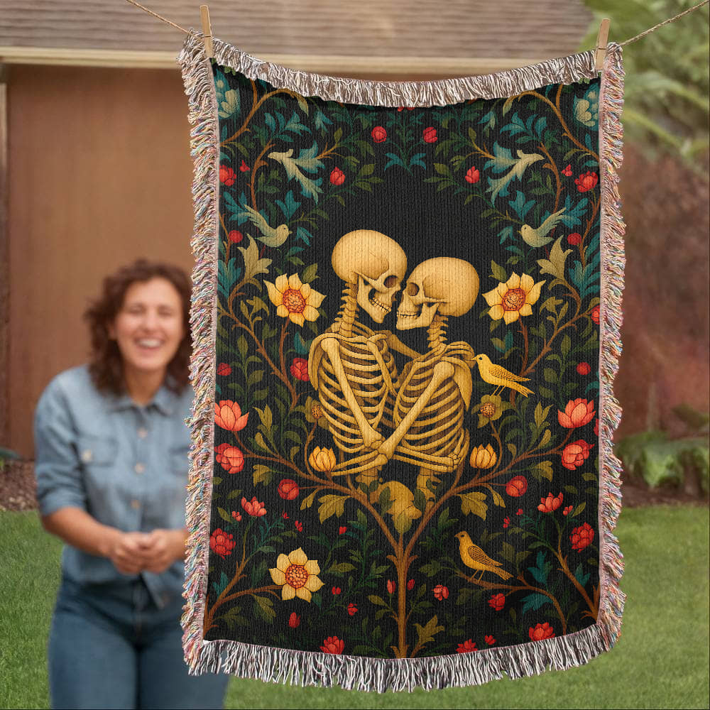 Premium Woven Cotton Throw – Skeleton Lovers in Enchanted Floral Border