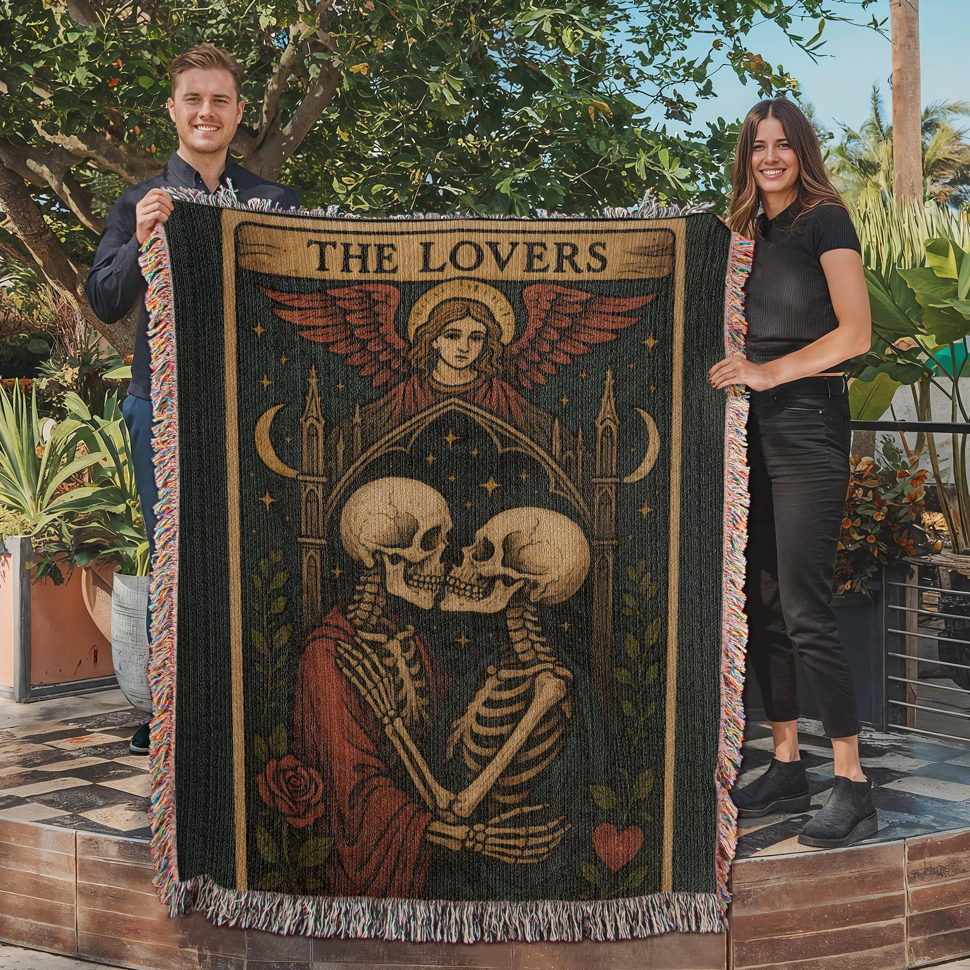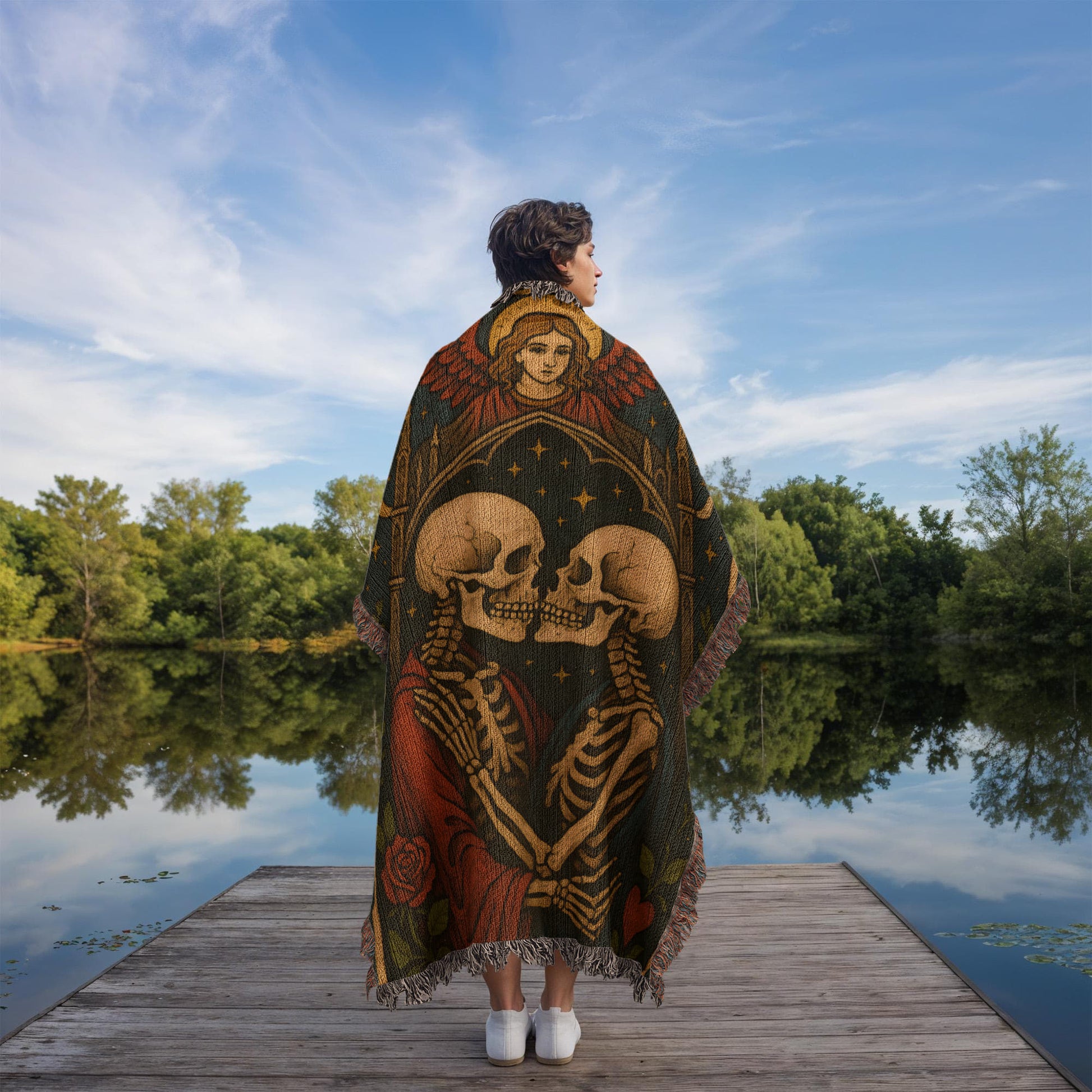 100% Cotton Woven Blanket – Gothic Skeleton Couple under Moon and Stars with Winged Angel, The Lovers Tarot Style
